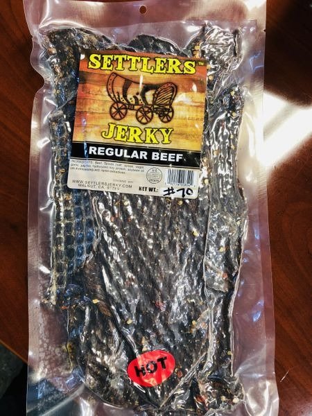This is our Hot Regular Beef Jerky. We have been producing this product since 1977. This was the only jerky we made at that time. When we started in San Gabriel. This product does not have a long shelf life. It is just salt and pepper on a thick steak cut, super fresh and holds up best in brown bag in a dark place. This product is mostly sold out of the deli case at mountain and ski resorts.